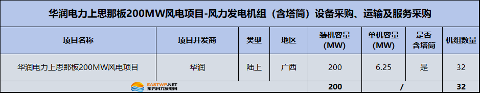 东方风力发电网讯:4月17日,华润守正采购交易平台发布《华润电力上思那板200MW风电项目-风力发电机组(含塔筒)设备采购、运输及服务采购 招标公告》,公告显示此次公开招标项目总容量为200MW,共1个项目、32台风机。