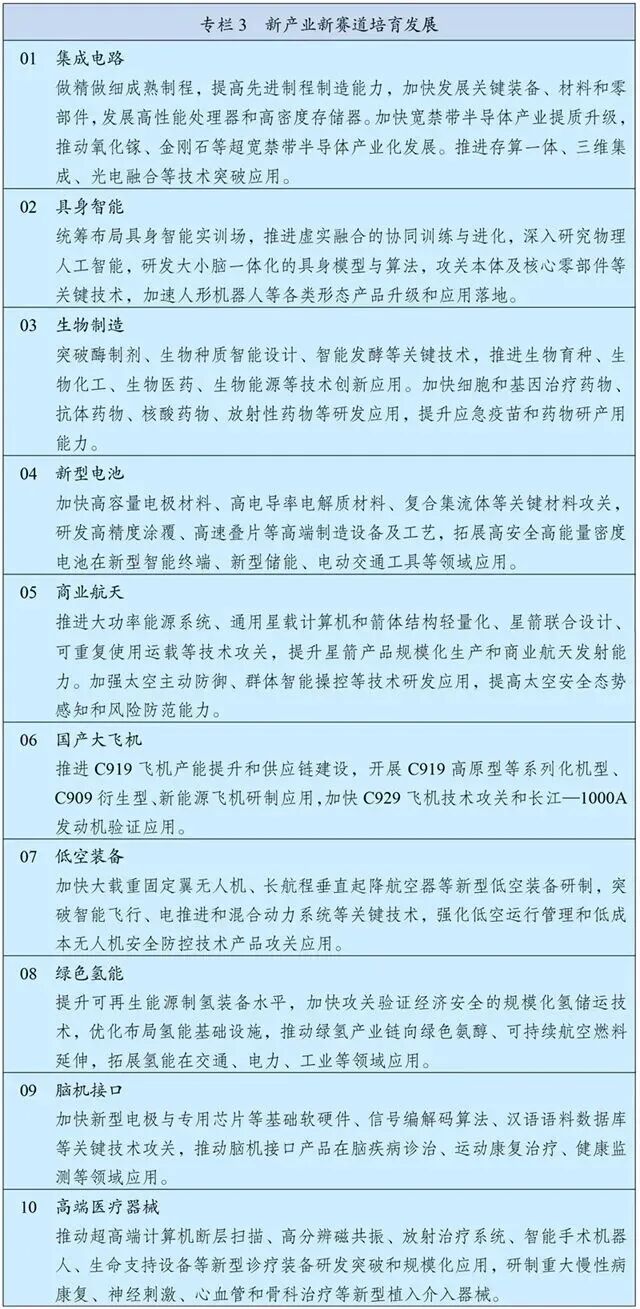 加快新一代信息技术、新能源、新材料、智能网联新能源汽车、机器人、生物医药、高端装备、航空航天等战略性新兴产业发展,因地制宜建设各具特色、优势互补的战略性新兴产业集群,着力打造一批成长潜力大、技术含量高、渗透领域广的新兴支柱产业。拓展海洋经济发展空间,推进低空经济健康有序发展。实施新技术新产品新场景大规模应用示范行动,加大场景培育和开放力度,加快新兴产业规模化发展。鼓励发展战略性产品和服务,推进国产大飞机规模化系列化发展,加强北斗系统创新应用,扎实推进智能驾驶、新型太阳能电池、新型储能等关键技术创新,支持创新药临床使用。