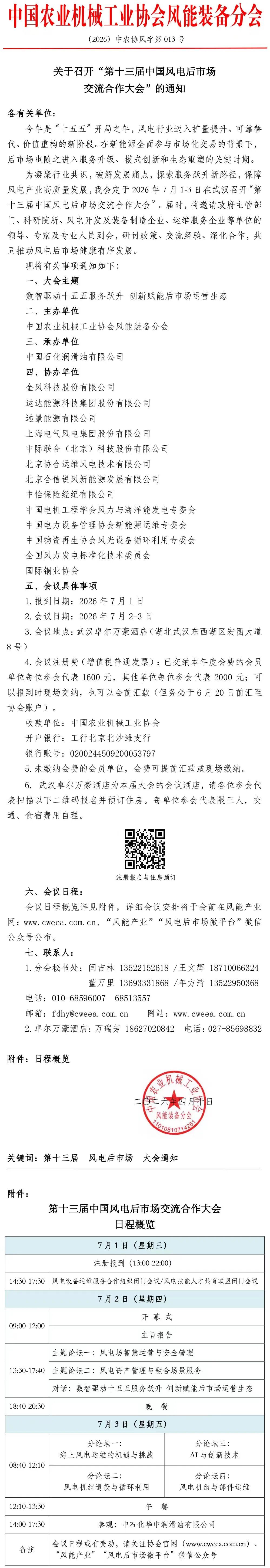 为凝聚行业共识,破解发展痛点,探索服务跃升新路径,保障风电产业高质量发展,我会定于2026年7月1-3日在武汉召开“第十三届中国风电后市场交流合作大会”。届时,将邀请政府主管部门、科研院所、风电开发及装备制造企业、运维服务企业等单位的领导、专家及专业人员到会,研讨政策、交流经验、深化合作,共同推动风电后市场健康有序发展。现将有关事项通知如下: